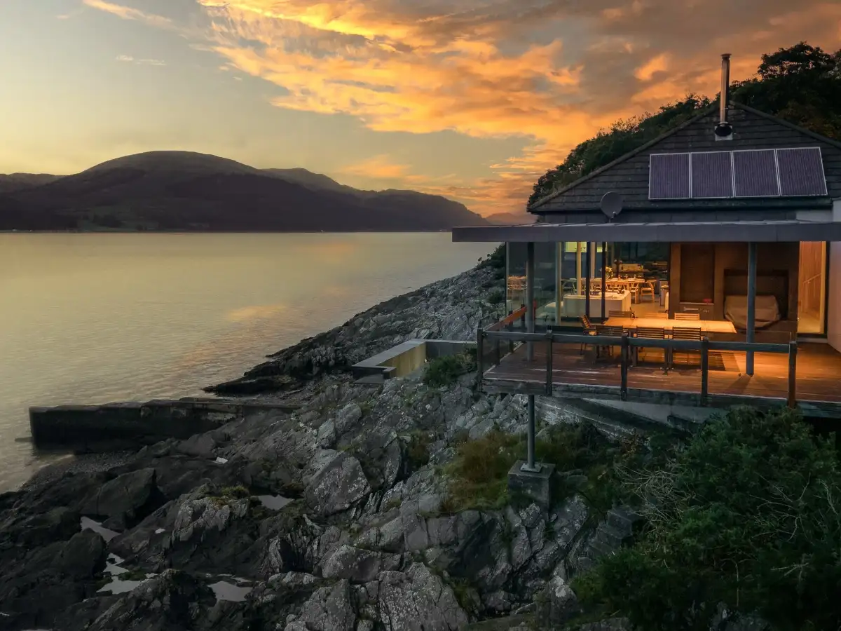 Overlooking the mysterious waters of Loch Long and the Firth of Clyde, this exquisite Scotland large holiday home with hot tub has won numerous architectural awards for its spectacular waterfront design. With an enviable beachfront location and exclusive use of a sheltered beach, jetty and mini pier, this exceptional property offers unparalleled access to Scotland’s dramatic coastal beauty. The tiny hamlet of Cove sits just 1.5 miles away, offering a welcoming pub perfect for delicious lunches and a wee dram of whisky.